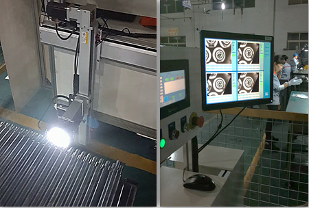 “剎車片分揀視覺系統”,本系統采用先進的圖像視覺檢測技術,實現對運動中的剎車片進行實時分揀。系統配備一臺高速工業相機,高速工業相機在不同的工位采集到剎車片圖像,并將圖像數據傳送到圖像處理系統,圖像處理系統對每幅圖像進行預處理、匹配定位、特征區域自動搜尋、相關尺寸測量等運算,并與標準模板圖像或設定的相關參數進行比較,如果發現不一致的區域并且超過設定的參數范圍,則輸出報警信號。