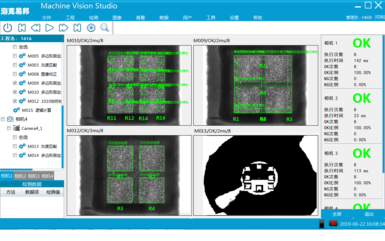 “HK-V6500N視覺控制器”,應用于四相機LED缺陷檢測,搭載視覺處理軟件MVS,采用交叉點定位或者匹配定位基于二值化、圖像校正插件、LED極性判斷、LED缺角檢測、LED亮色缺陷檢測、LED邊緣變形檢測等插件,實現LED缺陷檢測能。